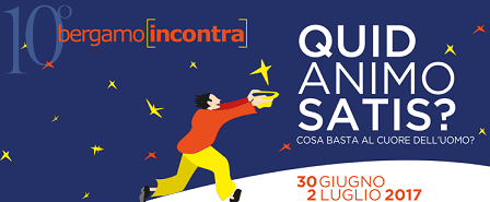 L’Associazione “BergamoIncontra” organizza dal 30 giugno al 02 luglio 2017 a Bergamo, presso piazza Dante e Sentierone, l’annuale iniziativa promossa a partire dal 2008. Il titolo della decima edizione è tratto dal Salmo 8: “Quid animo satis? Cosa basta al cuore dell’uomo?” Attraverso questa tre giorni abbiamo il desiderio di approfondire il bisogno dell’uomo di oggi e nostro: che dentro la quotidianità, fatta di gioie e affetti, ma anche di limiti e contraddizioni, si possa incontrare qualcosa di vero, incoraggiante, definitivo.