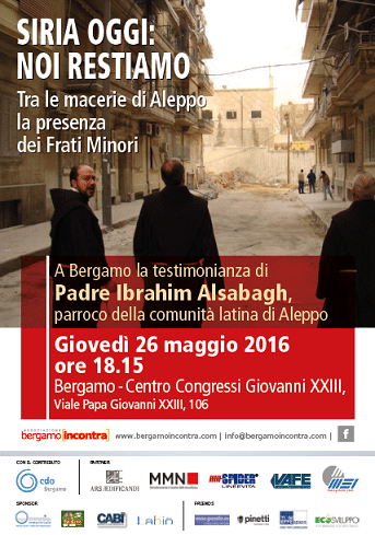 L’ Associazione Bergamo Incontra ha organizzato giovedì, 26 maggio 2016 presso il Centro Congressi Giovanni XXIII, a Bergamo, l’incontro testimonianza con padre Ibrahim, parroco della comunità latina di Aleppo in Siria dal titolo “Siria oggi: noi restiamo. Tra le macerie di Aleppo la presenza dei Frati Minori”. “Noi frati restiamo per aiutare la gente. È questo il tempo per essere ancora più presenti e in modo più forte con i poveri e con chi soffre: soffriamo con loro e preghiamo il Padre Provvidente e ‘ricco di misericordia’ con loro. Abbiamo una grande fiducia nell’intelligenza di Dio, Lui sa cosa è bene per noi. Anche qui”. La situazione della popolazione che vive in Siria sotto attacco raccontata in prima persona da chi ha deciso di restare nonostante tutto: Padre Ibrahim vive ad Aleppo, la sua parrocchia si trova sotto la protezione del governo regolare siriano a pochi metri dalla linea del fuoco jihadista.