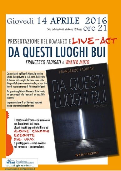 Il Centro Culturale “Alessandro Manzoni” organizza la presentazione del libro “Da questi luoghi bui” di Francesco Fadigati, Bolis Edizioni. Cosa unisce il traffico di Milano, le cantine umide dove provano le rock-band, l’alluvione di Genova e il risveglio dal come in un letto d’ospedale? Apparentemente nulla, se non si è letto il nuovo romanzo di Francesco Fadigati. “Da questi luoghi bui” è l’intreccio di tre storie, tre personaggi e la ricerca di un possibile incontro.