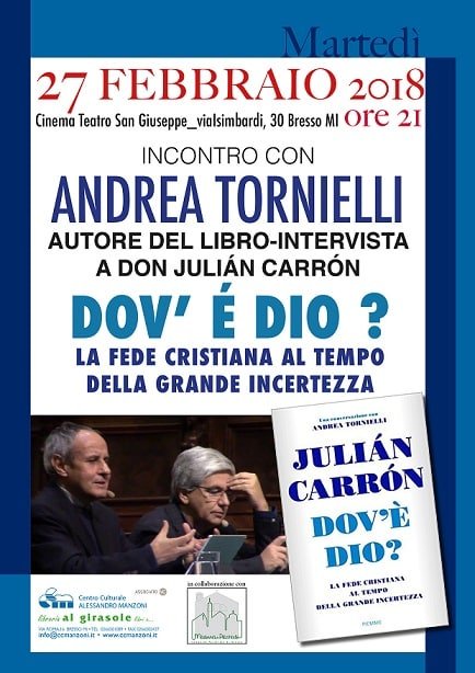 Il Centro Culturale “Alessandro Manzoni” in collaborazione con la Comunità pastorale di Bresso, ha organizzato la presentazione del libro “Dov’è Dio? La fede cristiana al tempo della grande incertezza. Una conversazione con Andrea Tornielli” di Julián Carrón (Piemme Edizioni, 2017).