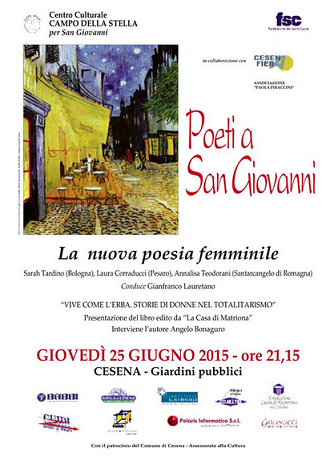 Il Centro Culturale Campo della Stella ha proposto all’interno della manifestazione “Poeti a San Giovanni” l’incontro sulla “Poesia al femminile” con Sarah Tardino (Bologna), Laura Corraducci (Pesaro), Annalisa Teodorani (Santarcangelo di Romagna). Nella serata è stato presentato anche il libro “Vive come l’erba” (ed. Casa di Matriona) con la partecipazione di uno degli autori, Angelo Bonaguro di Russia cristiana che ha fatto rivivere la voce e la testimonianza straordinaria di Dagar Simkova, una delle otto donne protagoniste del libro. Alternandosi alle letture di Gianfranco Lauretano ha raccontato la storia di questa giovane donna per cui il carcere di Pardubice, in cui venne rinchiusa insieme ad altre detenute politiche, divenne una seconda casa che paradossalmente segno’ per lei e per altre l’inizio di un percorso di conoscenza dell’umano, della fede, dell’arte. La loro fu una testimonianza di amore appassionato ad una bellezza capace di illuminare anche l’oscurita’ del gulag.