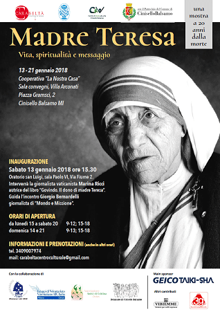 Sabato 13 gennaio 2018 ha preso il via a Cinisello Balsamo (Mi) la mostra “Madre Teresa. Vita, spiritualità e messaggio”, già presentata al Meeting di Rimini del 2016, che rimarrà esposta in Villa Arconati, piazza Gramsci 2, fino al 21 gennaio. La mostra è promossa dal Centro Culturale “Cara Beltà” con la collaborazione della Coop “La Nostra Casa” e del Centro di aiuto alla vita e con il sostegno di altre realtà di volontariato cittadine e del Decanato di Cinisello. Per l’incontro inaugurale, tenutosi in sala Paolo VI presso l’Oratorio San Luigi, è venuta a trovarci Marina Ricci, giornalista vaticanista che, coadiuvata da Giorgio Bernardelli, giornalista di Mondo e Missione, ha introdotto in maniera originale e personalissima la figura di questa santa venerata in tutto il mondo. Non poteva essere reso un omaggio più grande a Madre Teresa perché Marina Ricci non ha descritto le opere della Santa di Calcutta ma, attraverso la sua personale esperienza, ha reso possibile percepire come la santità di Madre Teresa operi negli uomini e li cambi attraverso l’evidenza e la semplicità del bene che scaturisce dalla sua totale appartenenza a Gesù, dal suo rispondere all’invito di Gesù di essere portato tra i più poveri dei poveri. Toccante il racconto dell’incontro di Marina con il piccolo Govindo, un bimbo indiano gravemente handicappato che lei e il marito decidono di adottare, introducendo nella loro famiglia un’esperienza che cambierà radicalmente il modo di porsi loro e dei loro quattro figli naturali. Due ore di incontro in una sala gremitissima e con il fiato sospeso nell’ascolto di una testimonianza di amore disinteressato che supera, proprio perché donato da un Altro, ogni capacità e intenzione umana.