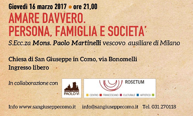 Nell’ambito delle iniziative per il cinquantesimo di consacrazione della chiesa di San Giuseppe in Como, la parrocchia di San Giuseppe, in collaborazione con il “Centro culturale Paolo VI” e con il patrocinio del Comune di Como, ha proposto un incontro dal titolo Amare davvero. Persona, famiglia e società. Relatore Mons. Paolo Martinelli, vescovo ausiliare di Milano, che affronterà una delle tematiche sui cui si gioca il presente e il futuro della nostra epoca, quella della persona e dei suoi affetti.
