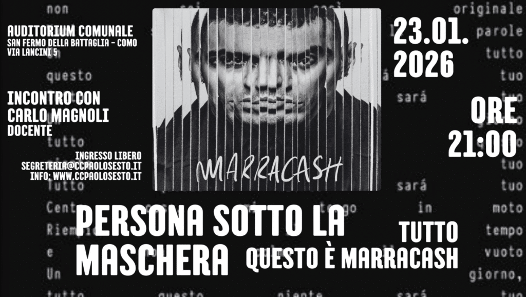 Venerdì 23 gennaio, alle ore 21, presso l’Auditorium comunale di San Fermo della Battaglia, saremo guidati da Carlo Magnoli, docente di Lettere, in un viaggio tra le canzoni del famoso rapper milanese, da Badabum cha cha, il primo grande successo, a Dubbi, un bilancio dei primi quarant’anni dell’artista, da La parola che nessuno riesce a dire, riflessione sulla solitudine e sulla condizione umana, a Io, richiesta di verità che «non ci hanno mai detto».