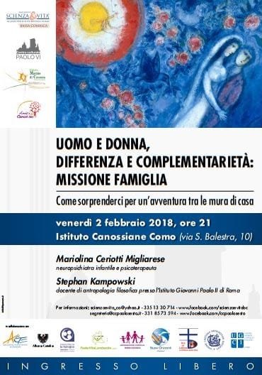 Il Centro Culturale “Paolo VI” è stato tra gli organizzatori dell’incontro “Uomo e donna, differenza e complementarietà: missione famiglia”. L’universo maschile e l’universo femminile, segnati da caratteristiche uniche, da criticità e, nello stesso tempo, da inesauribili risorse, saranno al centro dell’incontro Uomo e donna, differenza e complementarietà. È proprio dalla riscoperta di questa differenza e complementarietà che è possibile anche ridare significato alla parola “famiglia”, luogo naturale e spesso divertente – Come sorprenderci per un’avventura tra le mura di casa recita il sottotitolo della serata –, in cui la persona, fin da piccola, riceve e raccoglie tutti gli elementi necessari alla sua “costruzione” e può diventare così adulta. Tuttavia, oggi, molte persone non “credono” più alla famiglia e rinunciano al matrimonio.
