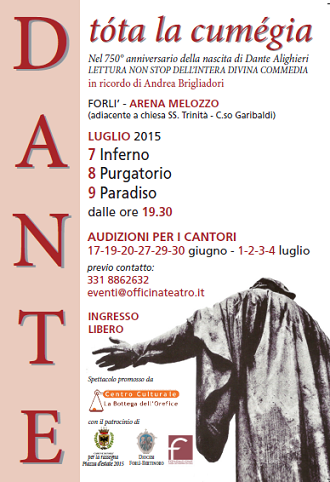 In occasione dei 750 anni dalla nascita di Dante Alighieri, a Forlì il 7, 8, 9 Luglio in tre serate consecutive, verrà letta l’intera Divina Commedia da lettori volontari. Promosso dal Centro Culturale La Bottega dell’Orefice e da Franco Palmieri, attore e regista, lo spettacolo è dedicato alla memoria di Andrea Brigliadori, volto nobile del mondo culturale forlivese.