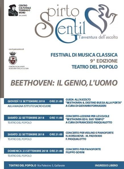 Primo appuntamento della IX edizione del Festival di musica classica “Spirto Gentil” con la guida all’ascolto della Quinta Sinfonia op. 67, concerto per pianoforte e violino di Beethoven.