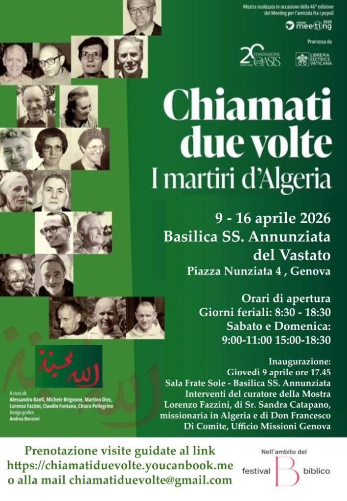 Giovedì 9 aprile ore 17.45. Sala Frate Sole – Basilica SS. Annunziata del Vastato, Genova. Inaugurazione della Mostra “Chiamati due volte. I martiri di Algeria”. Interventi del curatore della Mostra Lorenzo Fazzini, di Sr. Sandra Catapano, missionaria in Algeria e di Don Francesco Di Comite, Ufficio Missioni Genova.