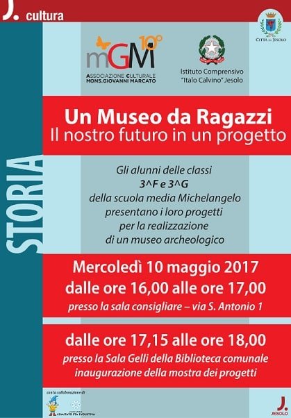 L’Associazione Culturale “Mons. Giovanni Marcato” organizza in collaborazione con l’Istituto Comprensivo “I. Calvino” di Jesolo (Ve), la presentazione della mostra dei progetti degli alunni delle classi terze della scuola media “Michelangelo” relative alla realizzazione di un museo archeologico “Un Museo da Ragazzi. Il nostro futuro in un progetto”.