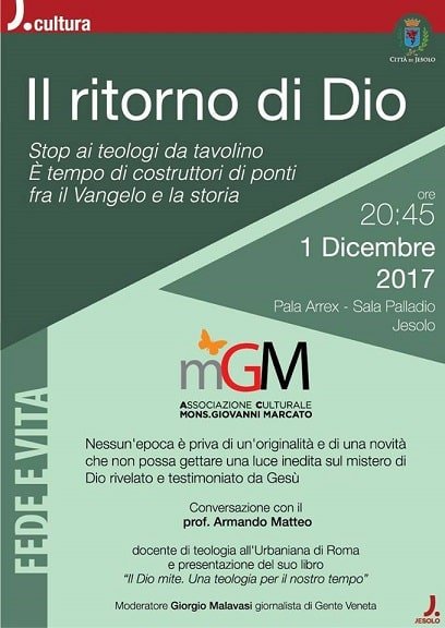 L’Associazione Culturale “mons. Giovanni Marcato” organizza “Il ritorno di Dio” conversazione con Armando Matteo, professore di Teologia all’Universitá Urbaniana di Roma. Nel nuovo appuntamento si vuole riflettere su una nuova proposta di teologia, lontana dai tecnicismi di settore e più rivolta al cuore dei suoi fedeli.