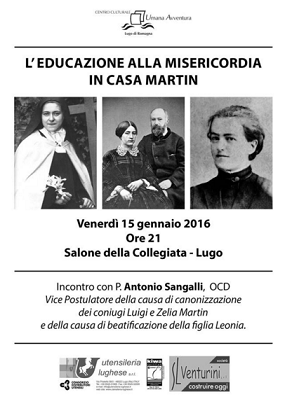 Tutti abbiamo seguito con stupore e devozione la permanenza a Lugo delle reliquie di Santa Teresa del Bambin Gesù e dei suoi genitori, Louis e Zelia Martin, lo scorso ottobre 2015. Il Centro Culturale “Umana Avventura” vuole dare un seguito a quell’evento invitando padre Antonio Sangalli, vice postulatore della causa di beatificazione e di canonizzazione dei coniugi Martin e della causa di beatificazione, tuttora in corso, della loro figlia Leonia, monaca visitandina, morta nel monastero di Caen nel 1941.