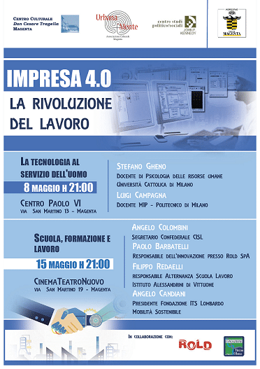 Primo incontro del ciclo ” Impresa 4.0 La rivoluzione del lavoro” promosso dal Centro Culturale “Don Cesare Tragella”, l’Associazione “UrbanaMente” e il Centro Studi “J.F. Kennedy” per approfondire e discutere gli scenari e le prospettive che ci attendono, sia per le imprese che per i lavoratori e dell’importante ruolo che avranno le scuole nella preparazione alle nuove professionalità.
