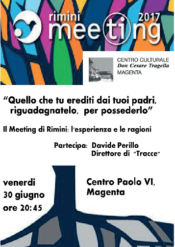 Il Centro Culturale “Don Cesare Tragella” organizza la presentazione del Meeting per l’amicizia fra i popoli che si svolgerà a Rimini, dal 20 al 26 agosto 2017 “Quello che tu erediti dai tuoi padri, riguadagnatelo, per possederlo”.