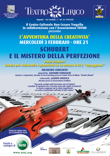 Il Centro Culturale “Don Cesare Tragella” è tra gli organizzatori del concerto “Schubert e il mistero della perfezione” con l’esecuzione della Sonata per violoncello e pianoforte in La minore D 821, “Arpeggione” di Franz Schubert. “Una perla assoluta nella brevissima vita di Schubert, costellata di capolavori che ci lasciano ogni volta stupiti ed ammirati. La musica raggiunge qui in modo stupefacente un vertice di perfezione nell’unità di tutti i fattori.”
