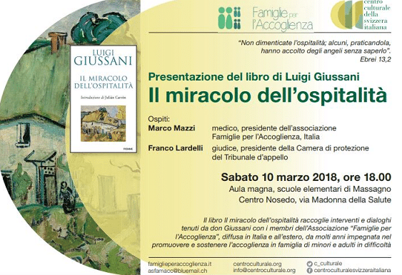 Il Centro Culturale della Svizzera italiana, in collaborazione con l’Associazione Famiglie per l’Accoglienza, vi invita alla serata di presentazione del libro “Il miracolo dell’ospitalità”. Il libro raccoglie interventi e dialoghi tenuti da don Giussani con i membri dell’Associazione “Famiglie per l’Accoglienza”, nata in Italia e diffusa anche in Svizzera, da molti anni impegnata nel promuovere e sostenere l’accoglienza in famiglia di minori e adulti in difficoltà.