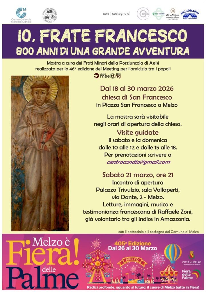 La mostra verrà allestita dal 18 al 30 marzo presso la Chiesa di San Francesco a Melzo e presenta il volto autentico di Francesco, “minore dei minori”, come lui stesso si definiva: un uomo che ha vissuto in pienezza seguendo soltanto il Vangelo.