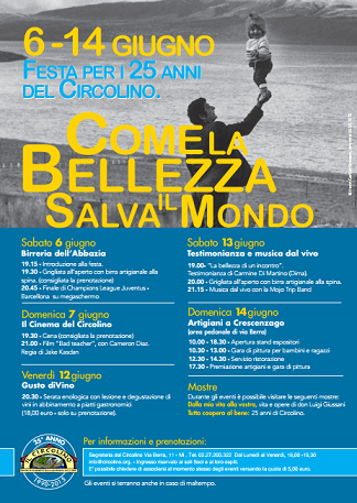 “Come la bellezza salva il mondo” è il titolo della manifestazione per i 25 anni di attività die Il Circolino. Dal 6 al 14 giugno musica, birra, serate tematiche, mostre, testimonianze, cinema e la tradizionale festa finale degli Artigiani.