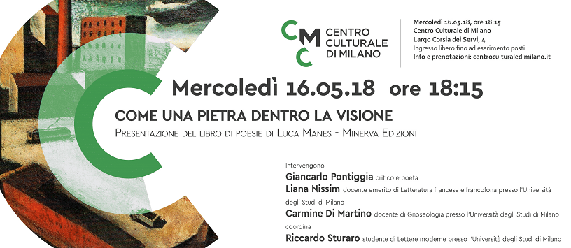 Il Centro Culturale di Milano organizza la presentazione del libro “Come una pietra dentro la visione” poesie di Luca Manes (Minerva Edizioni, 2018).