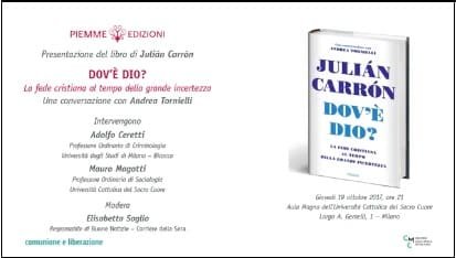 Comunione e Liberazione insieme al Centro Culturale di Milano e Piemme Edizioni hanno organizzato la presentazione del libro “Dv’è Dio? La fede cristiana al tempo della grande incertezza. Una conversazione con Andrea Tornielli”, di Julián Carrón, (Piemme Edizioni, 2017).