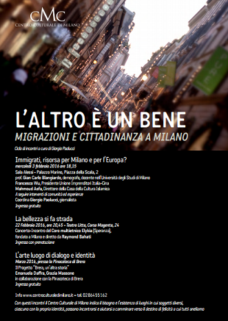 Nella storica Sala Alessi di Palazzo Marino, ha preso il via il ciclo “L’altro è un bene. Migrazioni e cittadinanza a Milano”. Con cui il Centro Culturale di Milano, in collaborazione con Nocetum, Vita, Progetto Arca, Casa della Cultura Islamica, Cooperativa Martinengo e Dialoghi di Vita buona, parla del confronto con l’altro nella società plurale, indicando l’esistenza di luoghi in cui soggetti diversi, ciascuno con la propria identità, possono incontrarsi ed aiutarsi a camminare verso il destino di felicità a cui tutti aneliamo. Una grande occasione di arricchimento fra identità diverse.