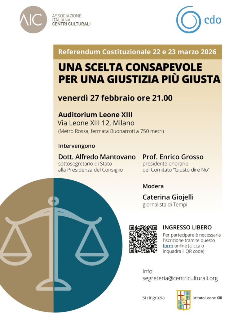 In vista del Referendum Costituzionale del 22 e 23 marzo 2026 , AIC e CDO organizzano un incontro pubblico per approfondire i temi della consultazione. L’appuntamento, dal titolo “Una scelta consapevole per una giustizia più giusta” , si terrà venerdì 27 febbraio alle ore 21.00 presso l’Auditorium Leone XIII di Milano.