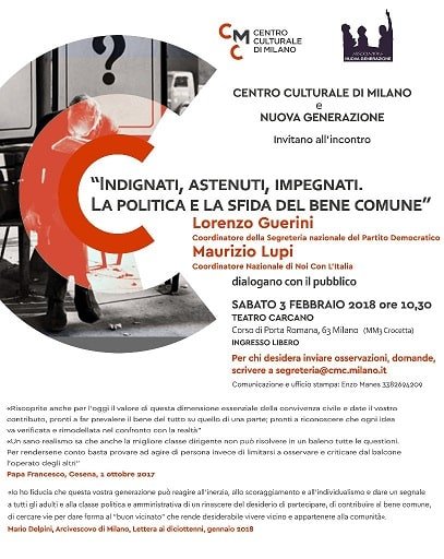 Il Centro Culturale di Milano e l’associazione “Nuova Generazione” hanno organizzato, in prossimità dell’imminente tornata elettorale, provocati dall’intervento del Papa a Cesena, l’incontro dal titolo “Indignati, astenuti, impegnati. La politica e la sfida del bene comune”. Una bella ed interessante iniziativa per cominciare ad entrare nel merito, evitando il rischio di stare al balcone o di appiattirsi su posizioni ideologiche. Questa circostanza decisiva per il Paese in cui tutto appare confuso e rissoso può essere reale occasione per un contributo.