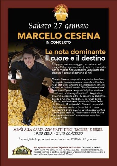Il Centro “Il Circolino” ha organizzato “La nota dominante. Il cuore e il destino”, il concerto testimonianza di Marcelo Cesena, pianista brasiliano. L’esperienza di un viaggio ricco di incontri inaspettati che cambiano la vita e il rapporto con la musica fino a scoprire la bellezza che domina il cuore di ognuno di noi.