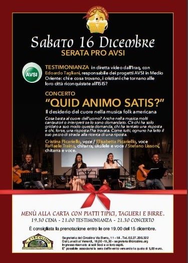 Il centro “Il Circolino” organizza “Quid animo satis?” Cosa basta al cuore dell’uomo? Concerto per la Campagna Tende 2017/2018 della Fondazione AVSI. Anche nella musica molti cantautori o interpreti se lo sono domandato. C’è chi ha solo gridato a suo modo questa domanda, chi ha tentato una risposta e chi, forse, una risposta l’ha trovata. Come tutti, ognuno ha fatto il suo pezzo di strada alla ricerca di una riposta.