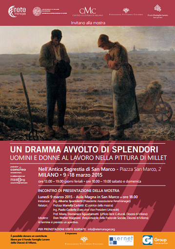 “Un dramma avvolto di splendori – Uomini e Donne al Lavoro nella pittura di Millet”, un’antologia dei dipinti di Jean Francois Millet tramite stampe, che Retemanager ha organizzato insieme a Fondazione Vittorino Colombo, Diocesi di Milano (Pastorale del Lavoro e Fondo Famiglia-Lavoro) e Centro Culturale di Milano, dal 9 al 18 marzo 2015 presso la Sagrestia della Chiesa di San Marco a Milano.
