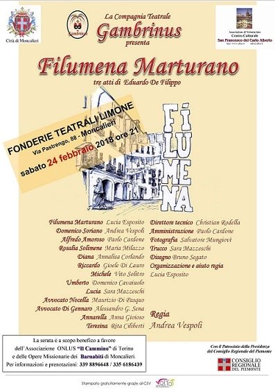 Il Centro Culturale “San Francesco del Carlo Alberto” in collaborazione con la Compagnia Teatrale Gambrinus presenta “Filumena Marturano”, commedia in tre atti di Eduardo De Filippo. La serata, a scopo benefico, è a favore dell’Associazione “Il Cammino” e delle opere missionarie dei Barnabiti di Moncalieri.