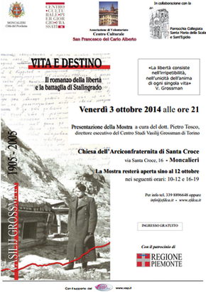 In chiusura dell’anno grossmaniano a cinquant’anni dalla morte dello scrittore, il Centro Culturale Pier Giorgio Frassati organizza la mostra su “Vita e destino: Il romanzo della libertà e la battaglia di Stalingrado” , esposta dal 3 al 12 ottobre 2014 a Moncalieri (To), con i seguenti orari 10-12 e 16-19 .