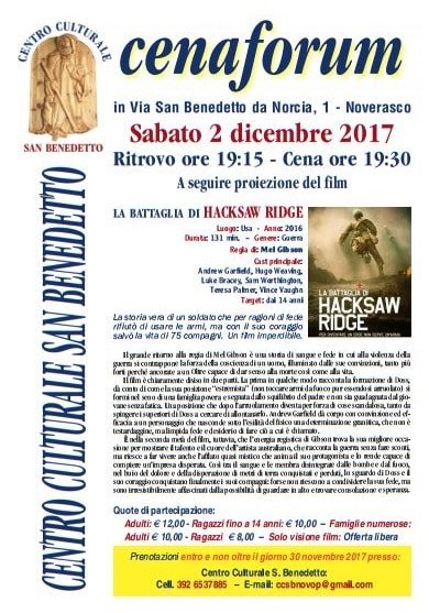 Il Centro Culturale “San Benedetto” organizza la proiezione del film “La battaglia di Hacksaw Ridge” di Mel Gibson. La storia vera di un soldato che per ragioni di fede rifiutò di usare le armi, ma con il suo coraggio salvò la vita di 75 compagni. Un film imperdibile.
