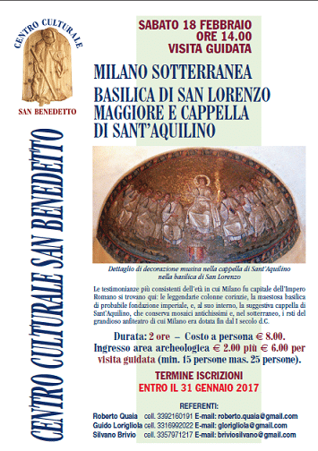 Il Centro Culturale “San Benedetto” organizza una visita guidata alla Milano sotterranea, alla Basilica di san Lorenzo Maggiore e la Cappella di Sant’Aquilino. Le testimonianze più consistenti dell’età in cui Milano fu capitale dell’Impero Romano si trovano qui: le leggendarie colonne corinzie, la aemstosa basilica di probabile fondazione imperiale, e, al suo interno, la suggestiva cappella di Sant’Aquilino, che conserva mosaici antichissimi e, nel sotterraneo, i rsti del grandioso anfiteatro di cui Milano era dotata fin dal I secolo d.C.