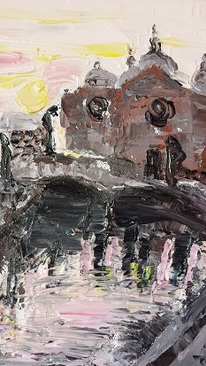 Cleofe Ferrari Bacino di San Marco alba«Anni fa, camminando per Venezia», prosegue Cleofe Ferrari, «e disegnando en plein air la facciata della basilica di Santa Maria della Salute e di San Marco, e poi ad Assisi le basiliche di Santa Maria degli Angeli e San Francesco, ho intrapreso questa avventura che mi ha portato qui oggi. L’occasione di ogni mostra è un momento importante: per mettermi umilmente a confronto con il pubblico e ridonare a tutti nell’incontro ciò che è accaduto a me».