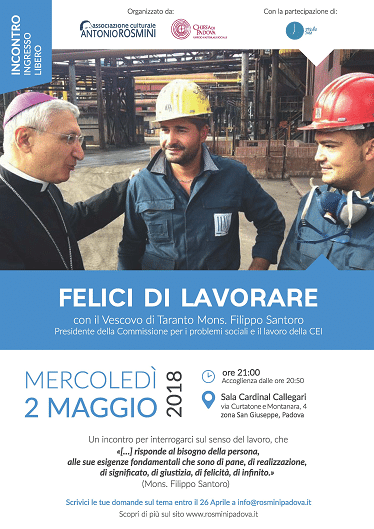 L’Associazione Culturale “Rosmini” è tra gli organizzatori dell’incontro “Felici di lavorare”. Il lavoro da sempre è uno dei principali aspetti della vita con cui l’uomo si rapporta alla realtà ed impegna la maggior parte del proprio tempo; oggi, con la crisi, è diventato sempre più competitivo, duro, umanamente difficile, precario e flessibile ed è sempre meno un posto fisso, diritto acquisito ed inattaccabile. Questo mutamento ha portato l’uomo a percepire il lavoro sempre più come un luogo ingiusto in cui resistere stringendo i denti e sempre meno come possibilità di essere felici e protagonisti.
