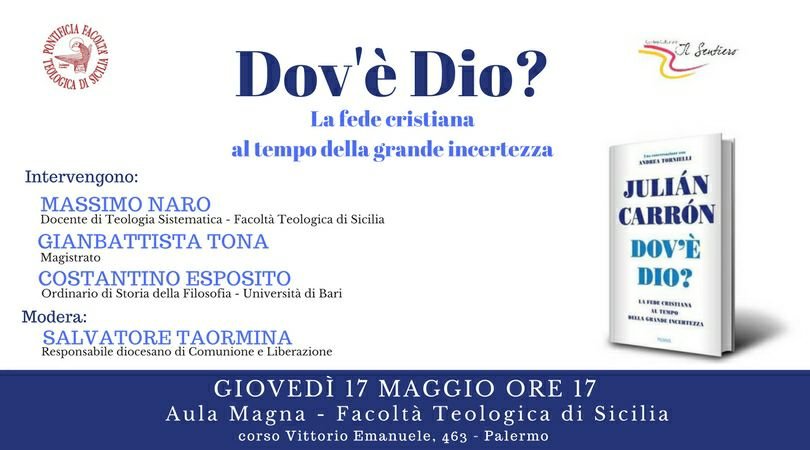 Il Centro Culturale “Il Sentiero” in collaborazione con la Facoltà Teologica di Sicilia ha organizzato la presentazione del libro “Dov’è Dio? La fede cristiana al tempo della grande incertezza. Una conversazione con Andrea Tornielli” di Julián Carrón (Piemme Edizioni, 2017).