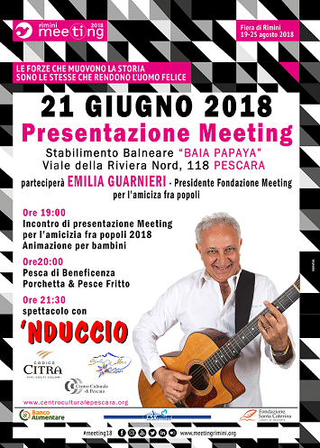 Il Centro Culturale di Pescara organizza la presentazione del Meeting per l’amicizia fra i popoli 2018 con Emilia Guarnieri, Presidente Fondazione Meeting per l’amicizia fra i popoli cui seguirà lo spettacolo con ‘Nduccio.