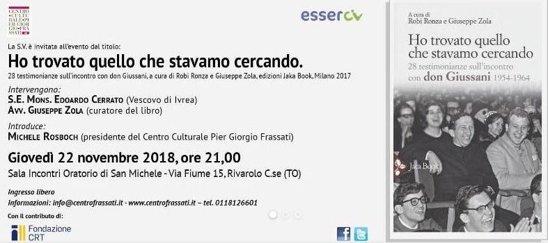 Il Centro Culturale “Frassati” in collaborazione con l’associazione “Esserci” ha organizzato la presentazione del libro “Ho trovato quello che stavamo cercando. 28 testimonianze sull’incontro con don Giussani” a cura di Robi Ronza e Giuseppe Zola (Jaka Book, 2017).