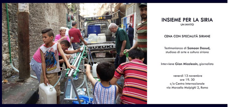 La serata prevede una cena a base di specialità siriane ed una testimonianza di Samaan Daoud, studioso di arte e cultura siriana con la partecipazione di Gian Micalessin, giornalista.