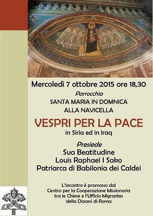 Il Centro Giovanile Il Centro segnala la celebrazione liturgica per la pace in Siria e in Iraq con la recita dei Vespri presieduti da Sua Beatitudine Louis Raphael I Sako, Patriarca di Babilonia dei Caldei e da Sua Ecc. Mons. Matteo Maria Zuppi.