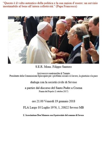 L’Associazione “Don Mezzera” ha organizzato l’incontro con mons. Filippo Santoro, arcivescovo di Taranto e Presidente della Commissione Episcopale per i problemi sociali e il lavoro, la giustizia e la pace. Un dialogo con la società civile partire dal discorso di Papa Francesco a Cesena (1 ottobre 2017).