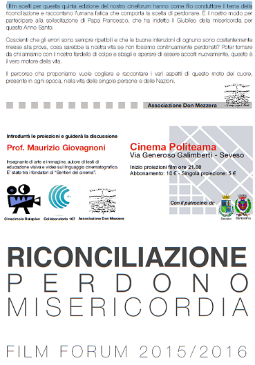 Prima proiezione del Film Forum 2015 2016 dal titolo “Riconciliazione, perdono e misericordia” promosso dall’Associazione “Don Mezzera”. I film scelti per questa quinta edizione del nostro cineforum hanno come filo conduttore il tema della riconciliazione e raccontano l’umana fatica che comporta la scelta di perdonare. È il nostro modo per partecipare alla sollecitazione di Papa Francesco, che ha indetto il Giubileo della misericordia per questo Anno Santo.