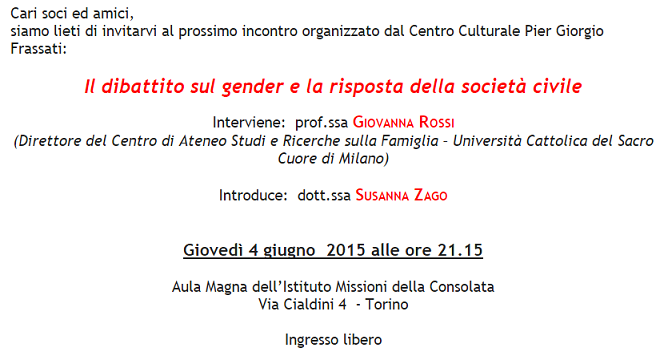 Il Centro Culturale Pier Giorgio Frassati organizza l’incontro dal titolo ” Il dibattito sul gender e la risposta della società civile”.