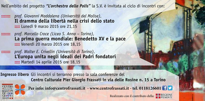 Il Centro Culturale Pier Giorgio Frassati organizza all’interno del ciclo di conferenze del progetto “L’orchestra delle Polis” l’incontro dal titolo “Il dramma della libertà nella crisi dello Stato”.