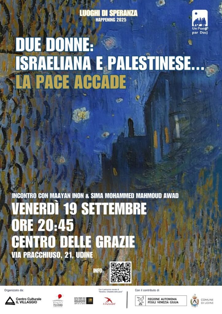 Ospiti saranno Sima Awaad, palestinese, e Maayan Inon, israeliana, rappresentanti dell’associazione The Parents Circle – Families Forum”. Il Forum riunisce oltre 800 israeliani e palestinesi che hanno perso un familiare nel conflitto e che hanno scelto di trasformare il dolore in un percorso di riconciliazione, dialogo e pace, rinunciando alla vendetta.