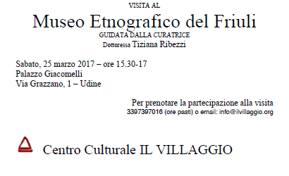 A Udine periodicamente un gruppo di profughi e di volontari si ritrovano per momenti di dialogo, di conoscenza reciproca, di condivisione, di scuola, di gioco, di esplorazione della realtà friulana, di solidarietà. Nell’ambito del Progetto “Tu sei un bene per me”, questo gruppo visiterà il Museo Etnografico del Friuli con la guida della curatrice, dottoressa Tiziana Ribezzi.