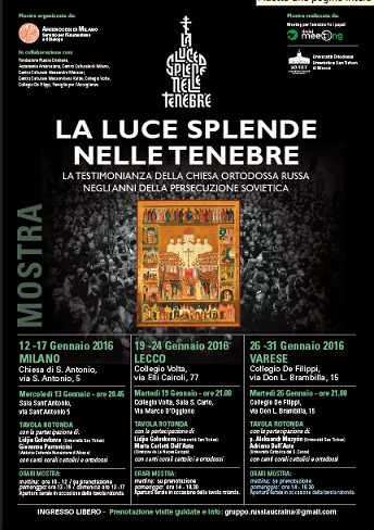 L’Arcidiocesi di Milano, Servizio per l’Ecumenismo e il Dialogo, insieme alla Fondazione Russia Cristiana, all’Accademia Ambrosiana, al Centro Culturale “Massimiliano Kolbe”, al Collegio “De Filippi”, organizza l’incontro di presentazione della mostra dal titolo “La luce splende nelle tenebre. La testimonianza della Chiesa Ortodossa russa negli anni della persecuzione sovietica”.